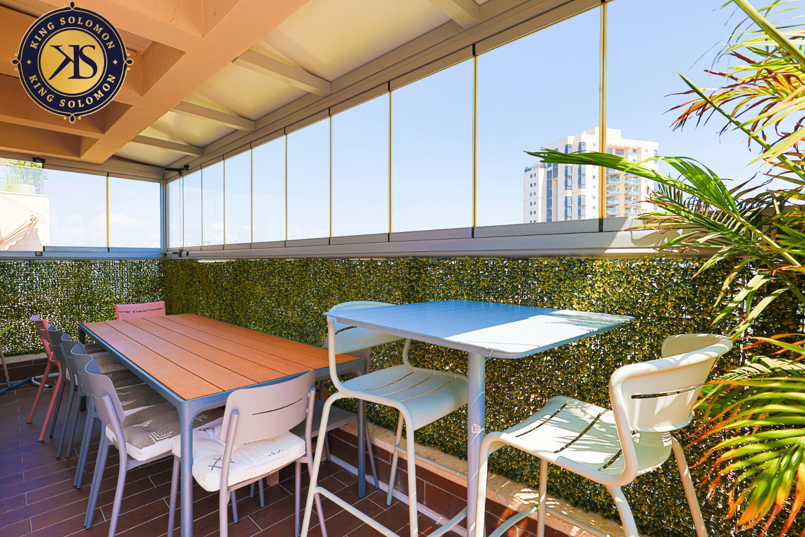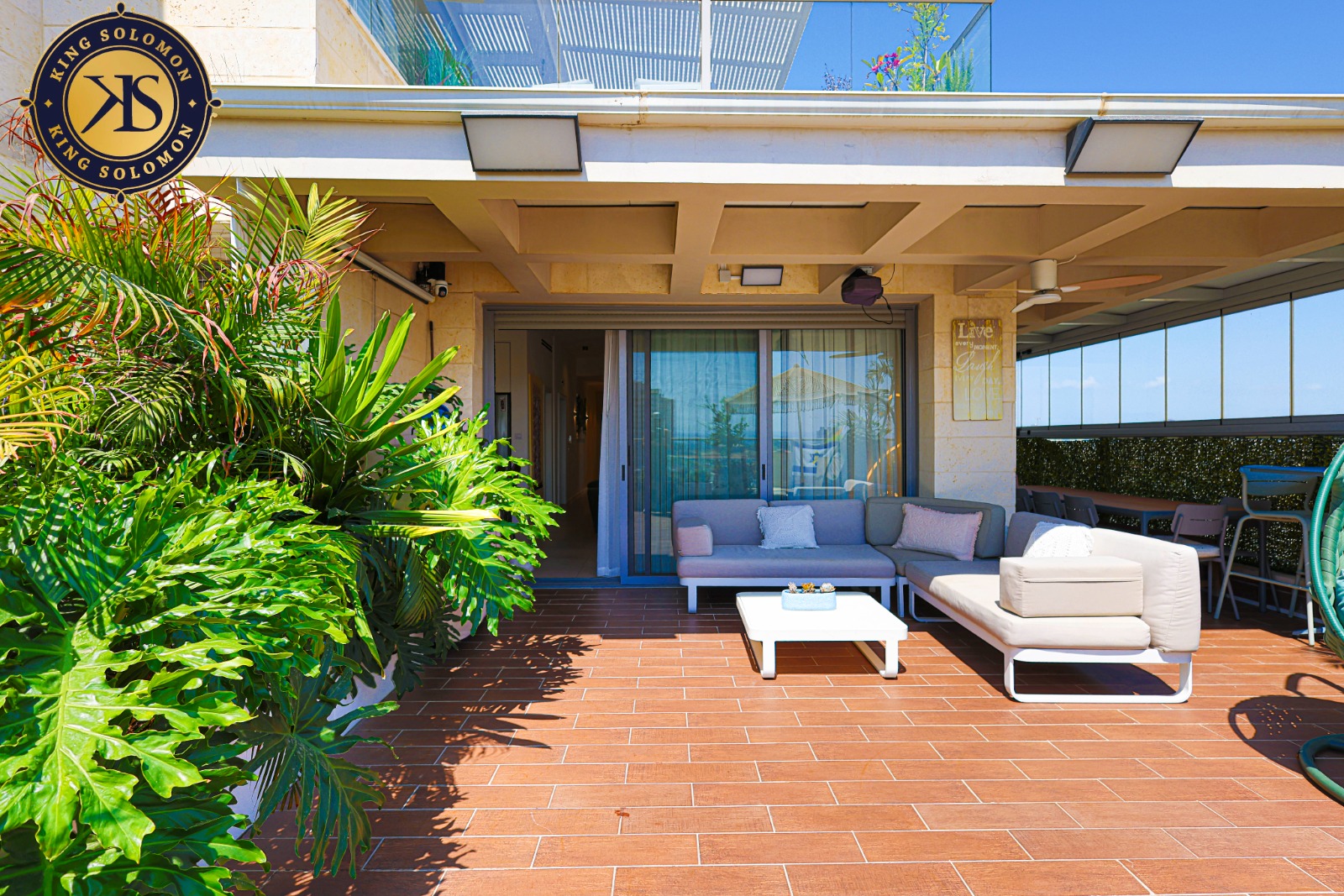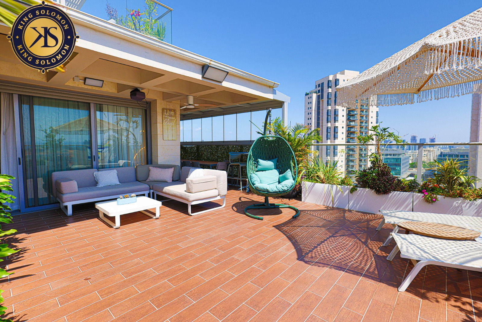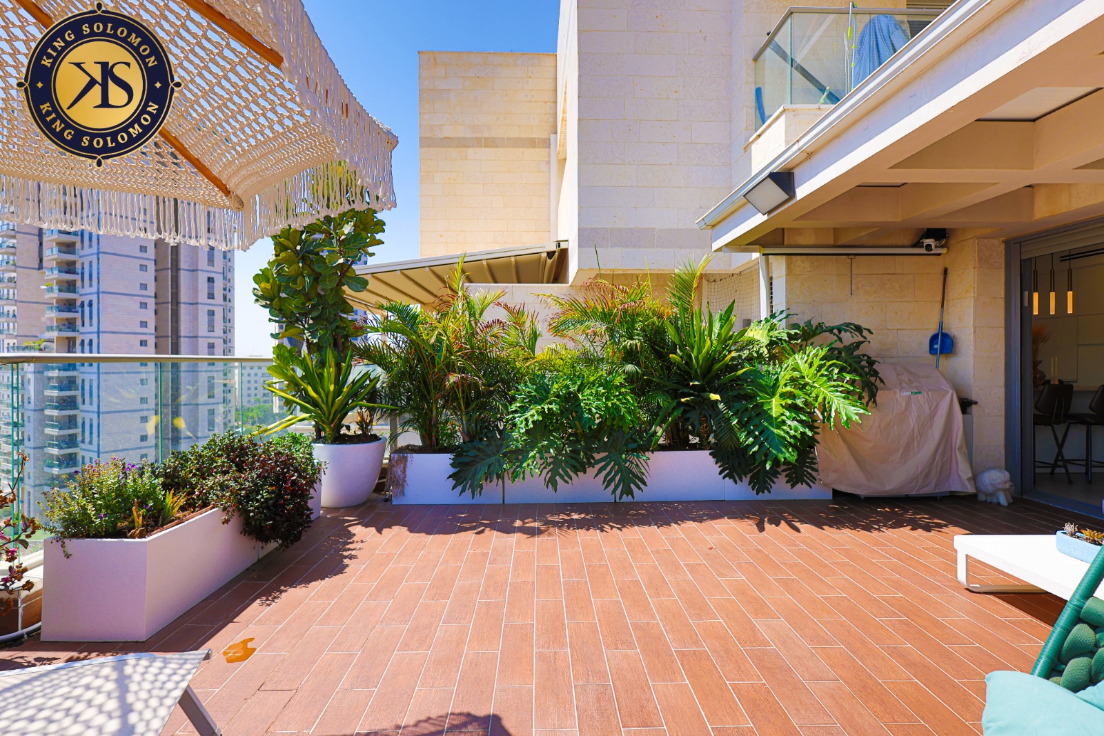 50 sqm de balcon de réception soigné avec des espaces de détente couverts.
