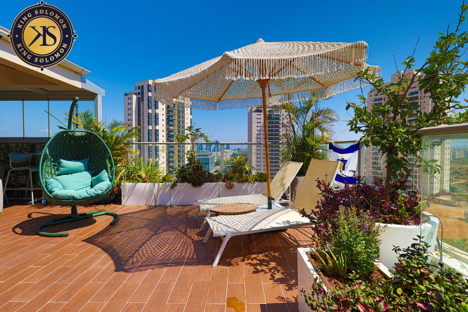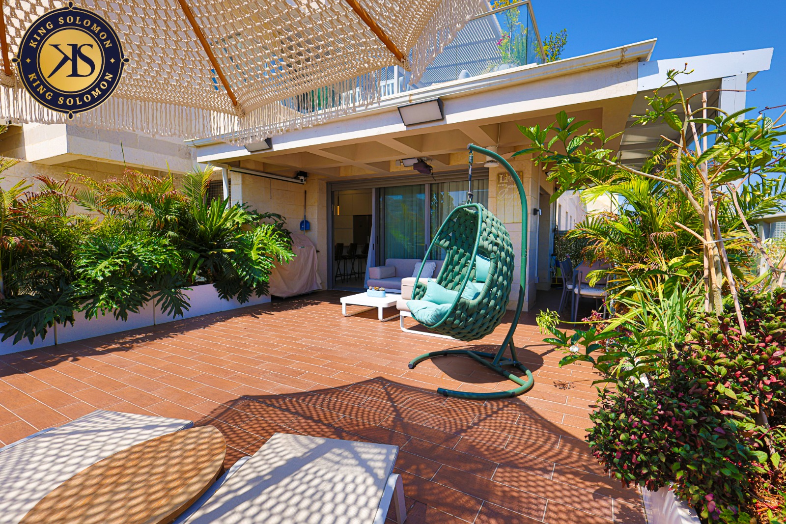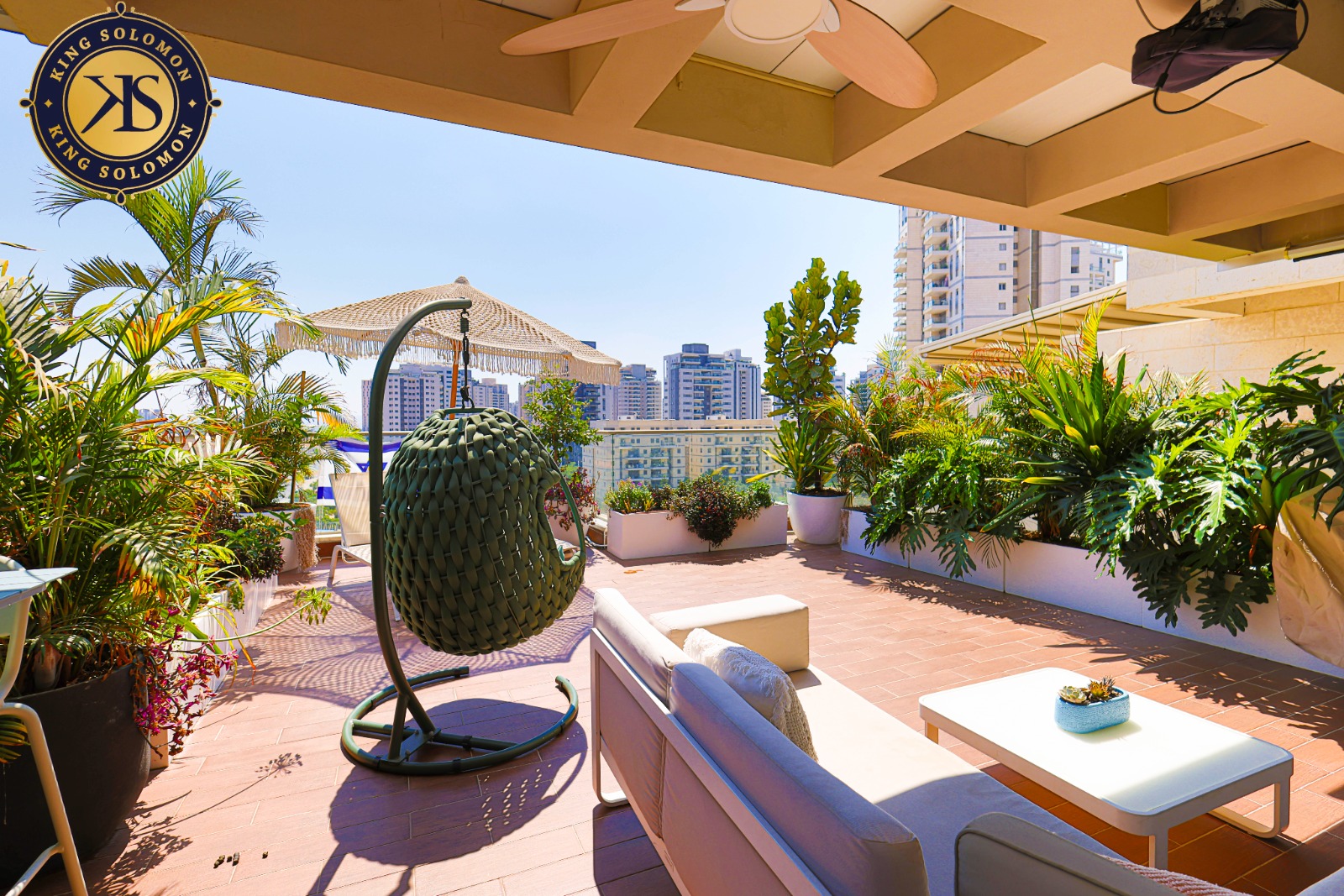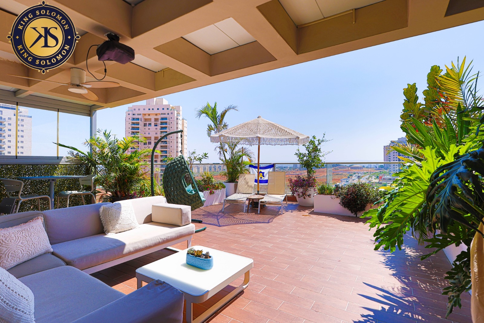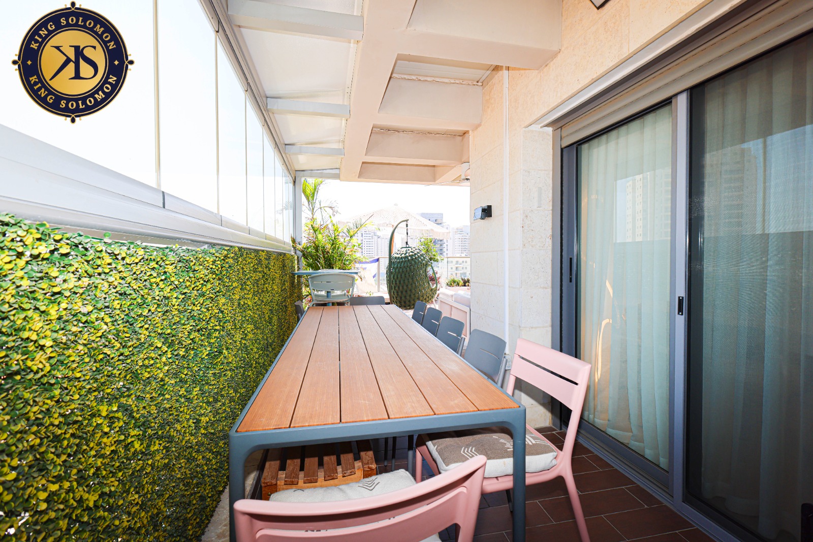 50 sqm de balcon de réception soigné avec des espaces de détente couverts.